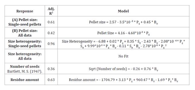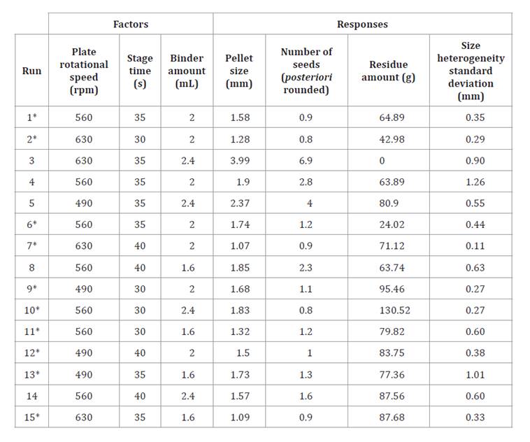 Weighted means: pellet size = 1.38 mm; number of seeds per pellet = 3.15; heterogeneity (SD) = 0.36. Single-response value: amount of residue = 25% at the end of the process.