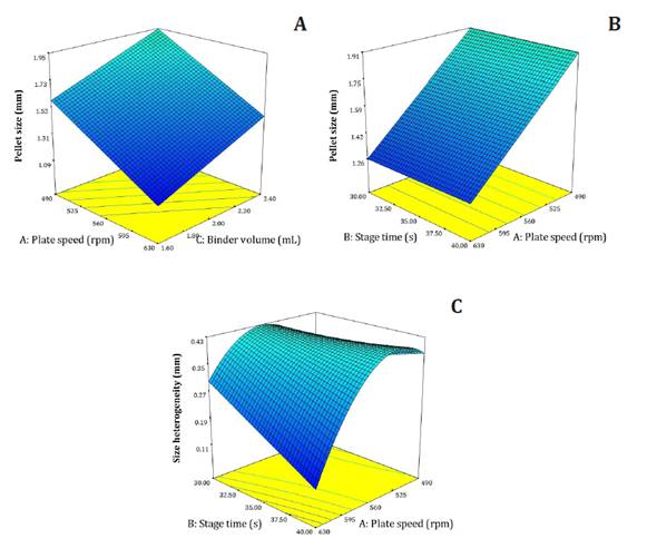 Models indicated that increasing the rotational speed of the rotary coater plate reduced pellet size (figure 2A-B). Conversely, greater binder volume increased pellet size for single-seed pellets (figure 2A).