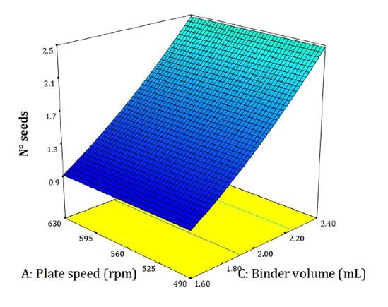 The model describing the number of seeds per pellet was significant (adjusted R² = 0.36; figure 3). Although predictive precision was moderate, the model adequately represented overall behavior (Pedrozo et al. 2024). Increasing binder volume led to the formation of conglomerates.