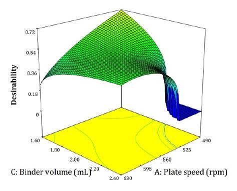 Maximum desirability was achieved at low plate speed and low binder volume. A marked decrease in desirability occurred under conditions of low plate speed and high binder volumes, corresponding to zones of formation of conglomerates and high residue accumulation.