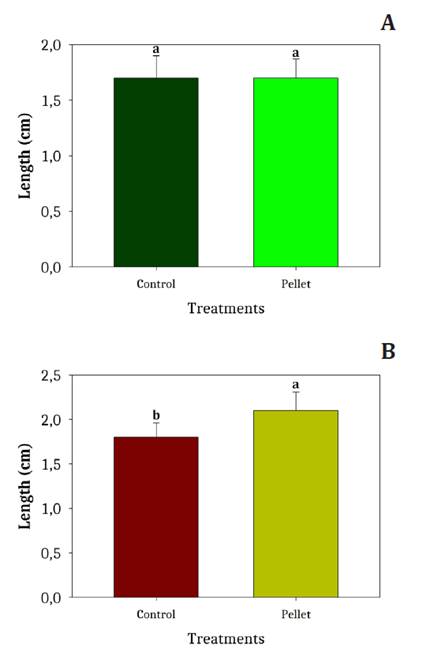 Shoot and radicle length results are shown in figure 7. Shoot length did not differ significantly among treatments. In contrast, radicle length was significantly greater in pelleted seeds (2.12 ± 0.17 cm) than in controls (1.78 ± 0.11 cm).