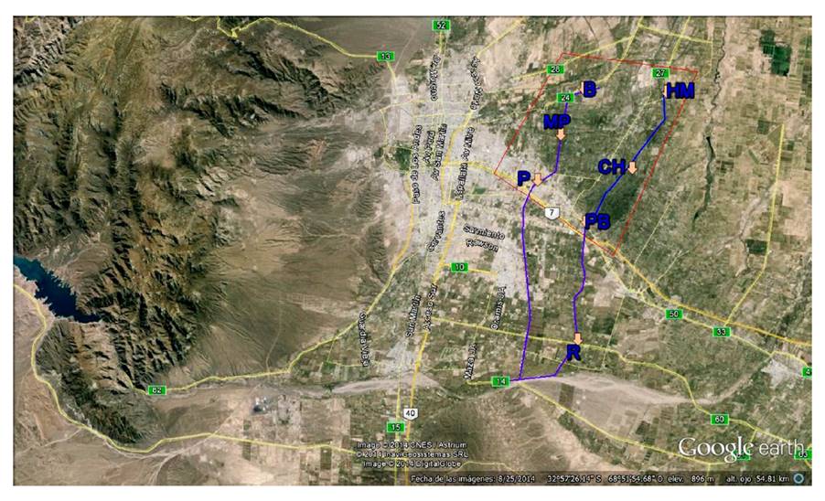 El área del cinturón verde de Mendoza se indica en rojo. Fuente: elaboración propia a partir de Google Earth.