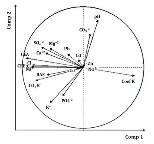 Figure 2 represents a correlation plane associating the measured variables (Cónsoli, 2015). The variables associated with component 1 (horizontal) include the alkali coefficient (K), CEA, CEE, SAR o RAS, and most of the ions present in the water. There is also variation related to component 2 (vertical), comprising the variables pH, PO₄ 3-, and CO₃ 2+.
