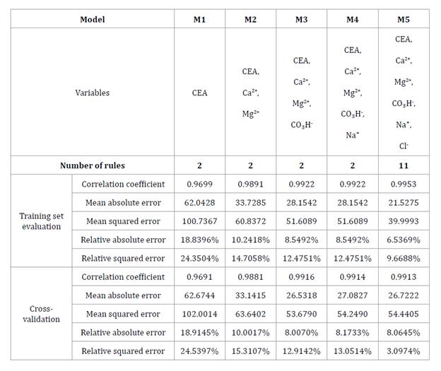 M1, M2, M3, and M4 generated identical rules: if CEA is less than or equal to 1292.5 μS cm-1, LM1 equation is to be applied, whereas if CEA exceeds this value, LM2 equation should be used (table 1). Equations depend on variables considered in each model. Although M5 includes more variables and has a good correlation coefficient, its complexity makes it less practical.