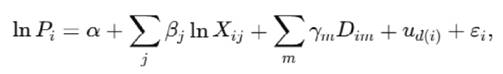 The preferred specification is a multilevel spatial hedonic model (MLM) with a log-log functional form, estimated on the full sample of 297 properties. The estimated coefficients are presented in table 3. The final econometric specification (m0F1_log) includes district-level random effects and an exponential spatial correlation structure, and is expressed as follows: