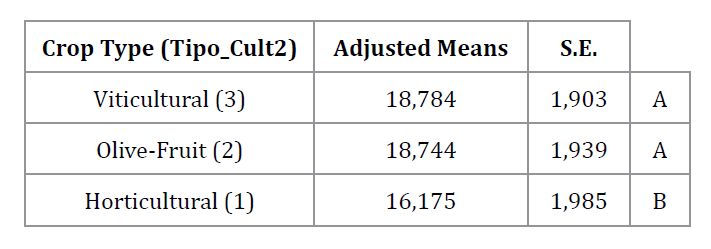 To examine the role of agricultural attributes, ANCOVA models were estimated to compare adjusted mean prices across crop types and irrigation water sources. Results show that crop type exerts a significant influence on market values (table 1): vineyards and fruit orchards command premiums of roughly USD 2,600/ha relative to horticultural land. Similarly, irrigation water access strongly differentiates land values (table 2): properties supplied with surface or mixed water achieve higher adjusted prices than those relying exclusively on groundwater.