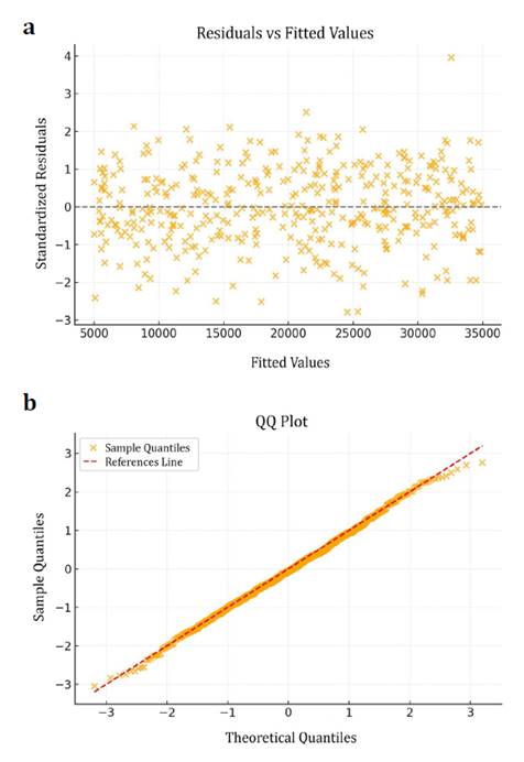 Residual diagnostics further support model adequacy. The scatterplot of predicted values against studentized residuals shows no systematic patterns, confirming homoscedasticity. Similarly, the normal Q-Q plot indicates approximate normality of residuals, with only minor deviations in the tails. These diagnostics (figure 3) strengthen confidence in the reliability of the model’s inference.