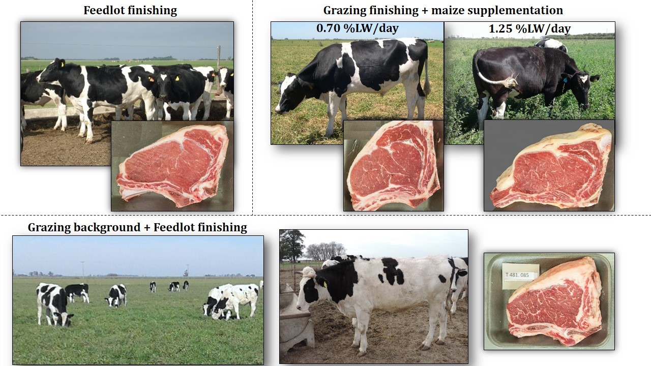 The objective was to evaluate the performance and meat quality of Holando Argentino (HA) steers under different feeding strategies. One hundred twenty-eight HA steers (181.4 ± 25.5 kg of live weight [LW]) were allocated to four treatments: FL: feedlot finishing during 98 days; Gr1.25: grazing with 1.25% LW/day maize grain supplementation during 235 days; Gr0.70: grazing with 0.70% LW/day maize grain supplementation during 331 days; and GrFL: 287 days grazing background and 116 days feedlot finishing. Average daily gains (ADG) were 1.14, 1.02, 0.82, and 0.81 kg/day for FL, Gr1.25, Gr0.70, and GrFL, respectively (p<0.01). Adjusted productivity ranged between 710 and 741 kg LW/ha (p>0.05). GrFL and Gr0.70 presented the highest carcass weight (CW; 288.3 ± 5.0 and 267.8 ± 12.2 kg, respectively, p<0.001). Gr0.70 presented the lowest longissimus thoracis (LT) L* (p<0.01) and the highest a* (p<0.05). Intramuscular fat was the highest for GrFL (4.86 ± 0.93%, p<0.05). In all strategies, LT shear force presented values of tender meat (29.9 ± 3.4 N, p=0.60). HA steers have the flexibility to produce tender meat under different, high-productivity strategies.