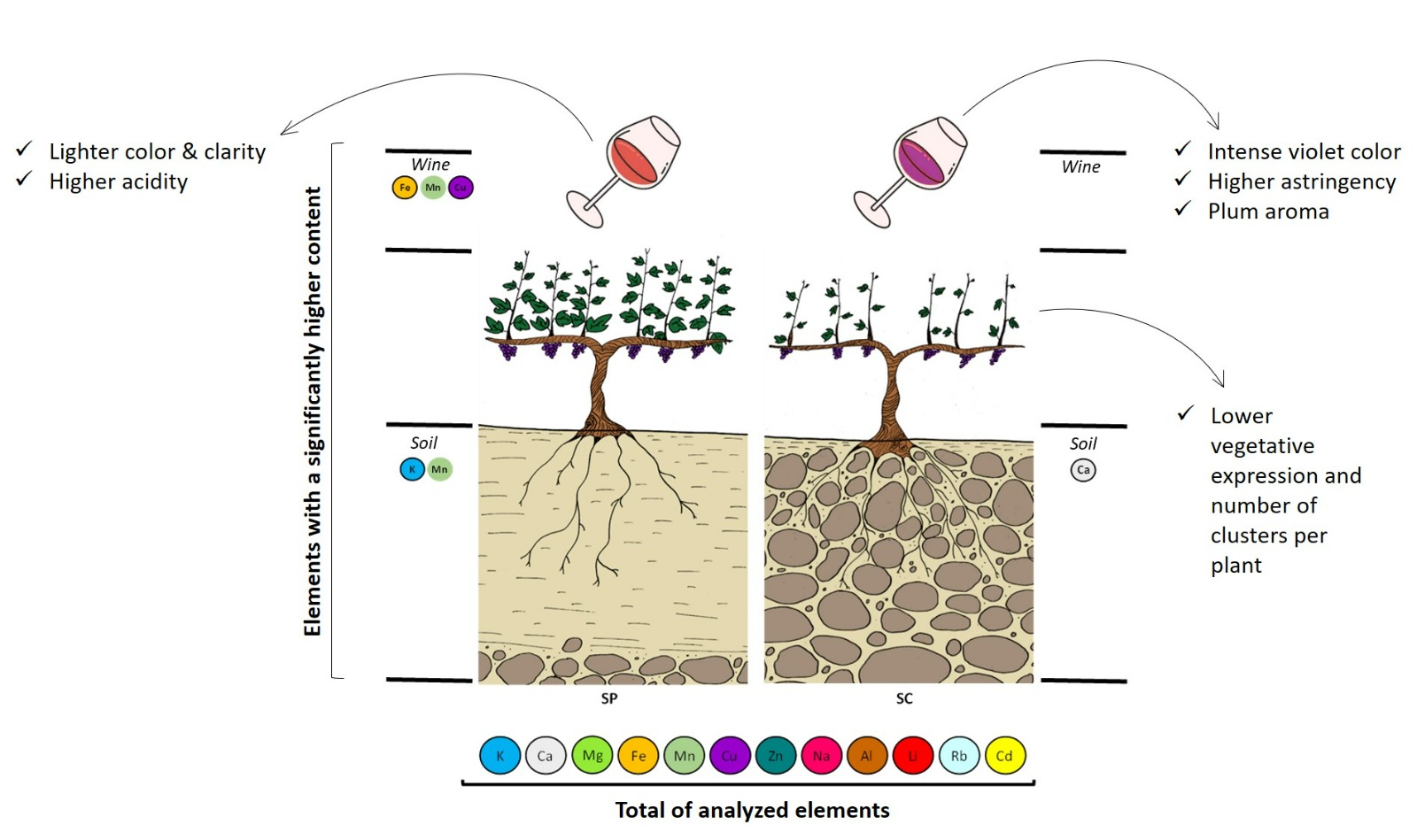 - Deep soils retain more water, have higher clay and silt content, and produce wines with higher Mn. In contrast, shallow soils are sandier and rockier, with lower water retention, leading to wines with greater color intensity, astringency, and structure.