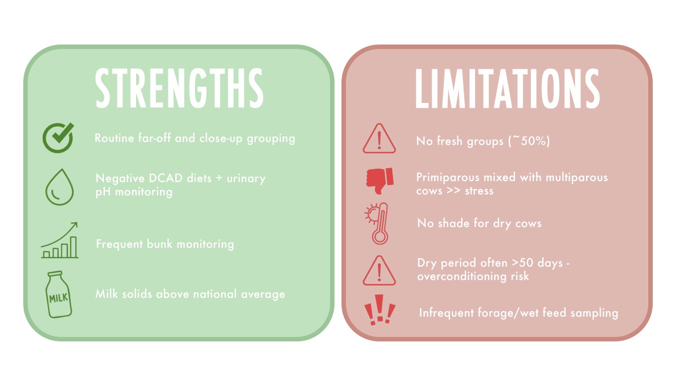 - Strengths: Routine far-off and close-up grouping, widespread use of negative DCAD diets, and frequent bunk monitoring contributed to low incidence of health disorders, culling, and mortality.